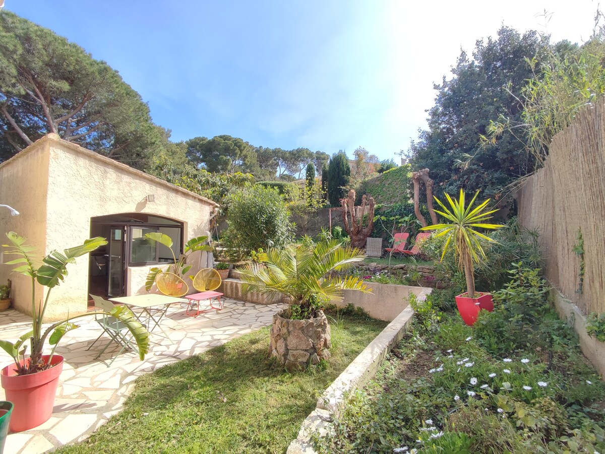 Maisonnette classée meublé tourisme ⭐️⭐️, grand jardin privatif au cœur de la nature sur les hauteurs de Toulon : la tranquillité de la campagne à 15 minutes de la mer! Le logement est refait à neuf mais a gardé le charme de l’ancien. Il dispose d’une pièce à vivre avec une cuisine équipée, d’une chambre en mezzanine, d’une salle d’eau avec douche italienne et d’un espace jardin privatif avec salon de jardin et transats. L’entrée est indépendante et un parking est disponible devant le logement.