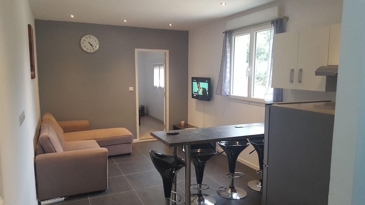 독립적인 접근성을 갖춘 2개의 숙소로 나뉘어 있는 마을 주택의 지하 1층에 침실 1개가 있는 작은 스튜디오입니다. 렌탈할 수 있는 숙소는 2인용 컨버터블 소파가 구비된 간이 주방과 더블 침대가 있는 침실로 구성되어 있습니다. 욕실 (샤워부스 및 화장실) 수건 제공 공용 정원 및 수영장, 테이블 소파 의자, 선라운지 자연 수영장으로 분류되는 강변 접근성 도보 5분 무료 주차 가능