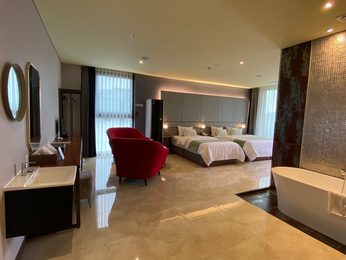 안녕하세요. 저희는 다양한 휴식 공간을 연구하고 제공하는 ONDA입니다. 이 곳에서 머무르실 모든 분들께서 편안하고 행복한 시간을 보내기를 바랍니다. [숙소 소개] 바다와 별빛이 어우러지는 시화호 거북섬에 위치한 신규오픈 호텔. 시화호의 푸른 물결과 거북섬의 자연경관을 한눈에 담을 수 있는 웨이브엠호텔 이스트. 현대적 감각과 편안함이 조화를 이루는 객실에서 멋진 호수 전망을 즐기며, 사랑하는 가족,친구,연인과 함께 최상의 휴식을 경험해보세요. [객실 유형] 분리형: 침대룸A(킹2)+화장실1