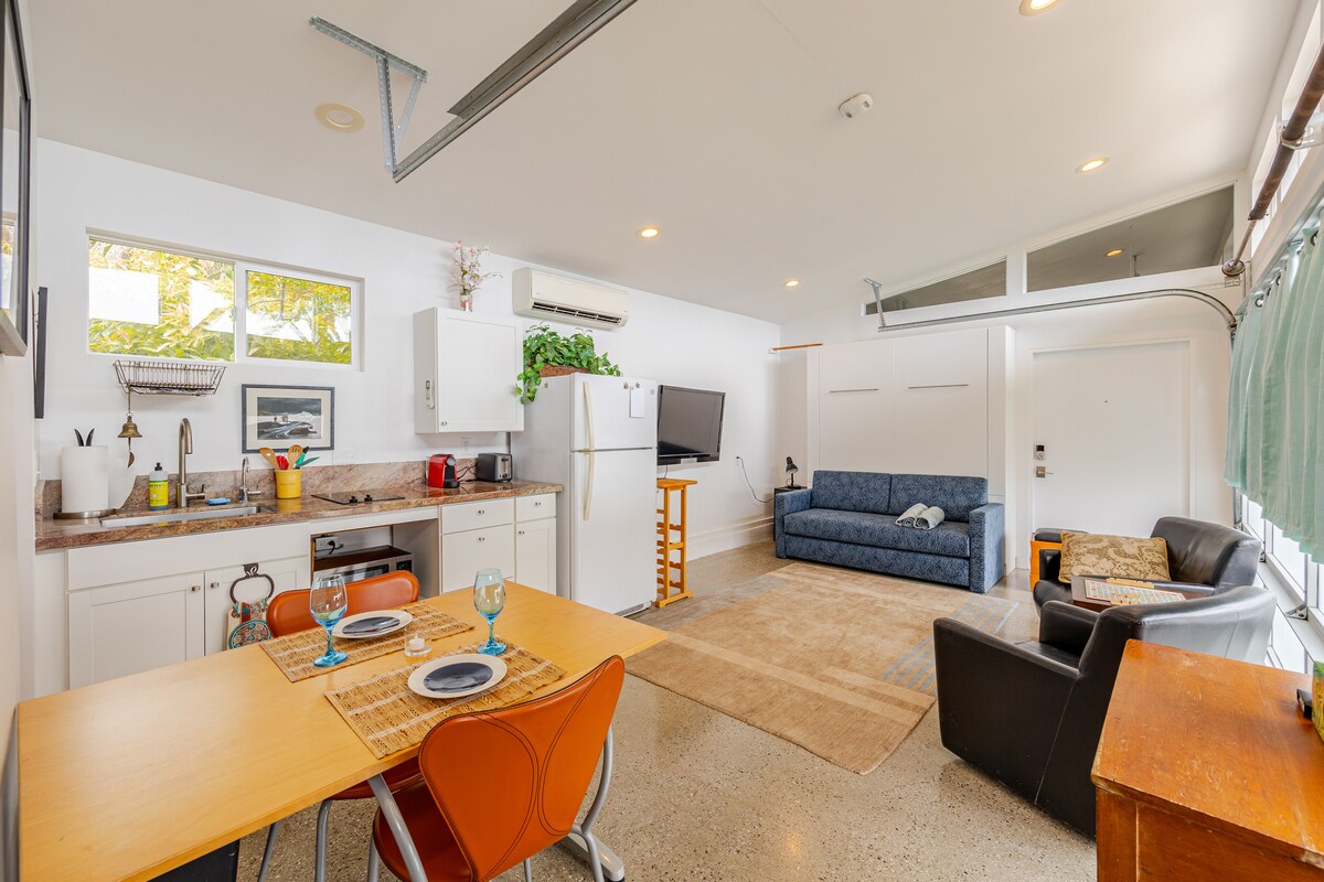 For a quiet night time stay and light-filled Studio in Costa Mesa with a lovely large European backyard behind our family home. The bright, sunny & airy one-room Studio with roll-up window wall is covered with interior window film with 1/2 curtains and furnished with a queen-size Murphy bed, dining table, love seat, and chairs, Kitchette, and TV. Walk in shower. Enjoy the temperate weather of Coastal Orange County and relax in a patio area with its chairs and table.