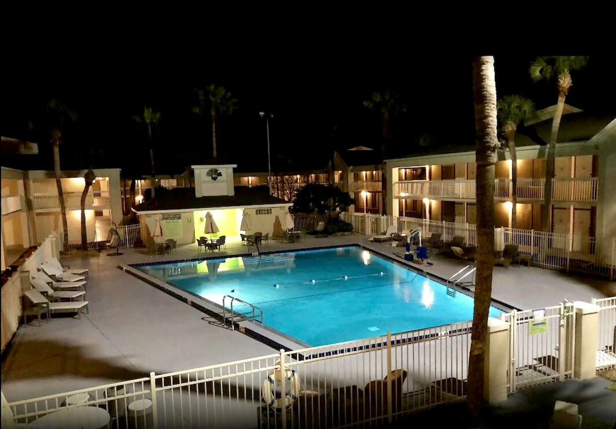 10 min from Disney theme parks, discounted Disney park tickets Free water park on site . Restaurants, Krispy Kreme , gift shops , grocery store, pizza store , Walmart within walking distance .14 heated pools on property.