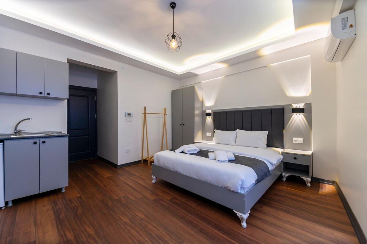 저희 객실은 고급스럽고 모던하며 세심하게 디자인되어 있습니다. 저희 호텔에 위치한 이 객실은 대형 더블 침대, 43인치 스마트 텔레비전, 전용 욕실을 갖추고 있습니다. 저희 객실에는 미니 냉장고와 작은 주방 용품이 있는 작은 주방이 있습니다. 저희 객실은 1층에 있습니다. 연중무휴 카메라와 보안 시스템이 있습니다. 건물 외부 문은 특별히 코딩되어 보호되어 있습니다. 저희 객실은 2명을 수용할 수 있도록 설계되었습니다.
