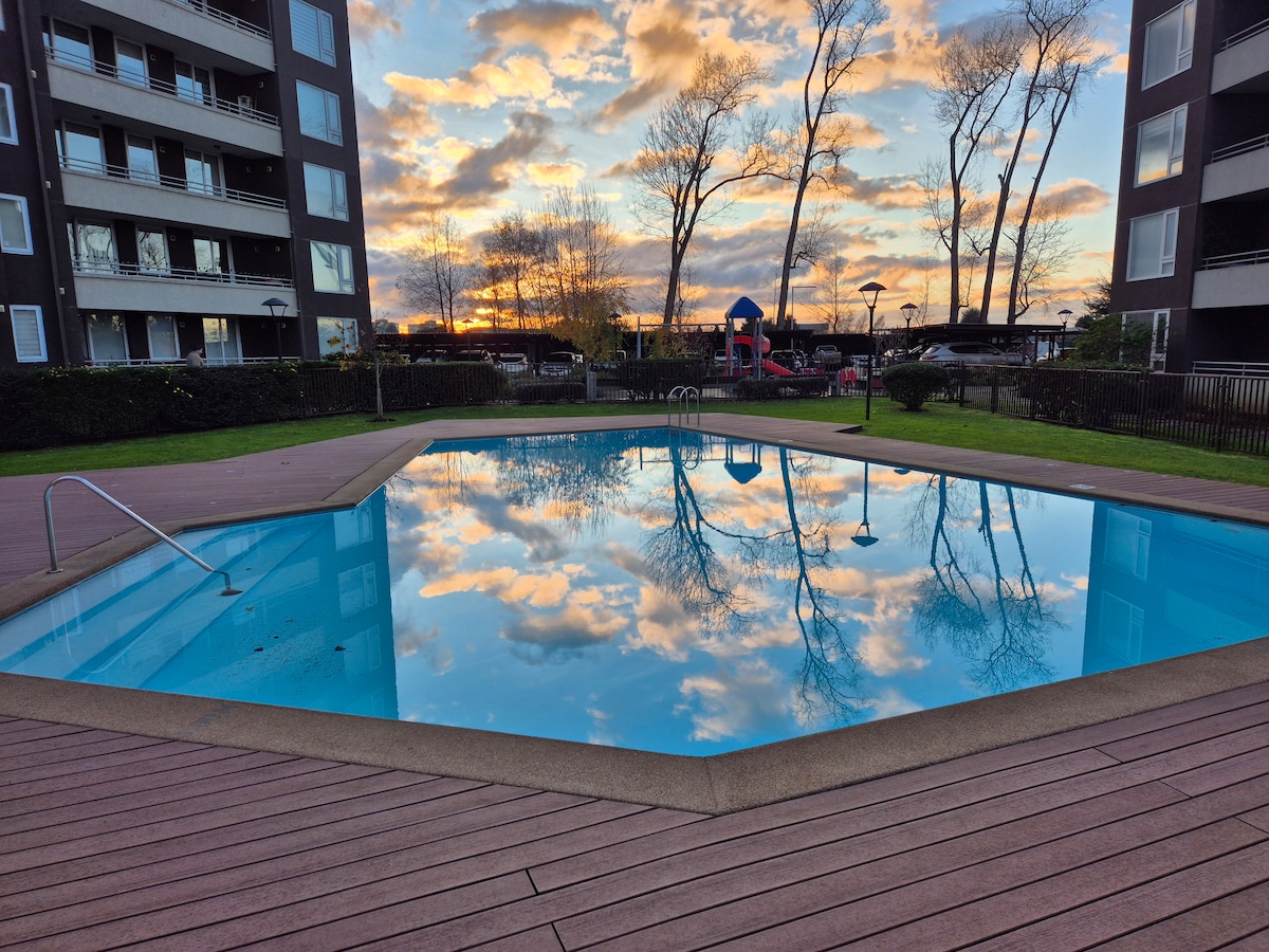 오소르노 동부 지역에 위치한 4인용 편안한 아파트입니다. 성인을 위한 아름다운 수영장과 어린이를 위한 작은 수영장이 있습니다. 세탁기/건조기가 구비된 주방. 어린이 놀이터, 녹지 공간 및 주차장 이용 가능. 오소르노, 푼티아구도, 칼부코 화산의 아름다운 전망. 슈퍼마켓, 약국 및 스트립 센터에서 50미터 거리에 있는 문으로 이동합니다. 24시간 컨시어지, 출입 통제.