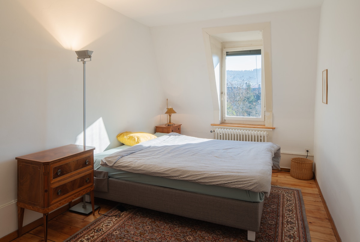 Cozy and bright, self-contained 2 bedroom, second floor walk-up at the top of our home. At the front of Länggasse, 4 minutes walk to the main station, 8 to the old town. One very comfortable box spring bed, the second bed is a good quality pull-out sofa-bed that pulls out to a queen size. We've an extra single bed we can put in at your request. Separate kitchen, large bathroom and hallway. Kids and pets very welcome. Washer & dryer available in basement. Communal staircase.