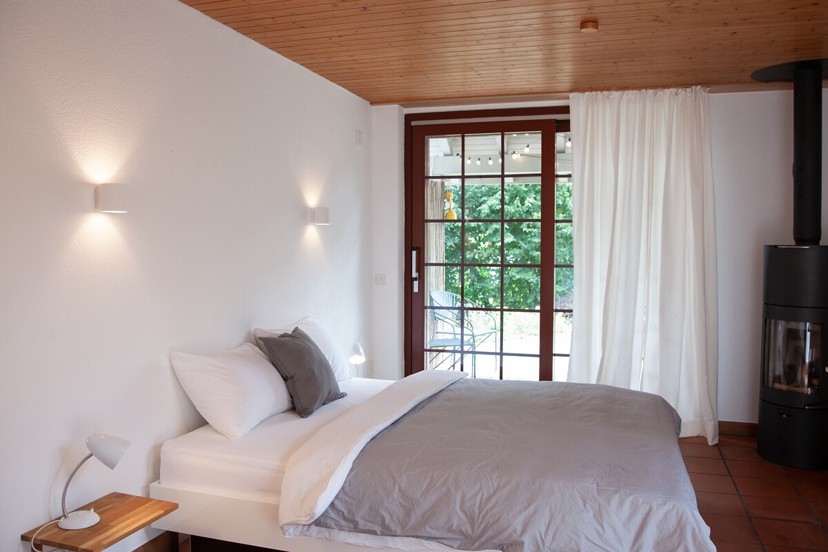 Willkommen in unserem Gästezimmer mit Terrasse, Kamin und Blick in den Garten. Zum Zimmer gehören ein Bad mit Dusche und ein WC. Ideal für einen Aufenthalt von 1 – 2 Personen. Gut zu wissen: Dein Zimmer wird NUR von dir genutzt. Es gibt KEINE gemeinsam genutzten Räume. – Queensize-Bett (160 x 200 cm) – Kaffeemaschine & Kaffee Pads – Wasserkocher & Tee – Minibar-Kühlschrank – Schwedenofen – Nichtraucherzimmer – Keine Haustiere – Parkplatz – Ladestation E-Auto – Neu: verdunkelnde Vorhänge
