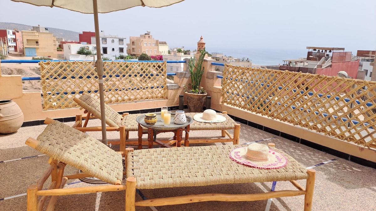UNIQUE À MIRLEFT UNE CONFORTABLE MAISON DE VILLAGE. Un excellent rapport QUALITÉ/PRIX. Vous êtes 1, 2, 3, ou 4, vous envisagez une halte ou des vacances à Mirleft, dépaysantes et ressourçantes. Je vous propose une maison de plain-pied avec une belle cour ensoleillée et une terrasse, dans un endroit populaire et calme. Facile d’accès, cette maison très bien équipée vous comblera pour un séjour de qualité. Court, long, ou même très long. Son emplacement au cœur du village est très apprécié.