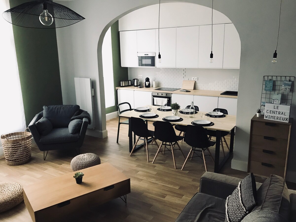 하이퍼센터 - 쇼핑 거리 한가운데에 위치한 개성 있는 오래된 건물 1층 가족 - 95m² 규모의 아파트 최대 7명(성인 4명, 어린이 3명(만 18세 미만), 아기 1명) 밝음(동서 방향 교차로) 및 차분함 넓은 공간 아름다운 볼륨 고급 숙박 시설 옛 매력 현대적인 편안함 완비된 편의시설 트렌디한 인테리어 혜택 침구 포함 도착 시 침대 준비 1인당 수건 2장 주차 1대 포함(두 번째는 선택 사항) (www.)lecentralwimereux(.fr)