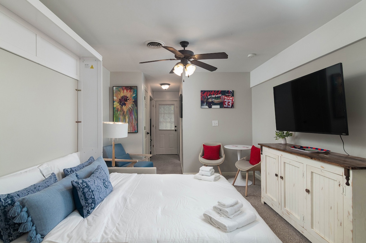 Just over a mile from the vibrant downtown square, this cozy 550 sq ft retreat atop a detached garage offers a queen bed, an oversized chair that pulls out into a twin bed, a kitchenette, a full bath, a smart TV, WiFi, washer/dryer, and patio. Conveniently located 2.3 miles from Ole Miss campus with parking included. Ideal for exploring Oxford's charm! *During the school year, weekends are a two night minimum*