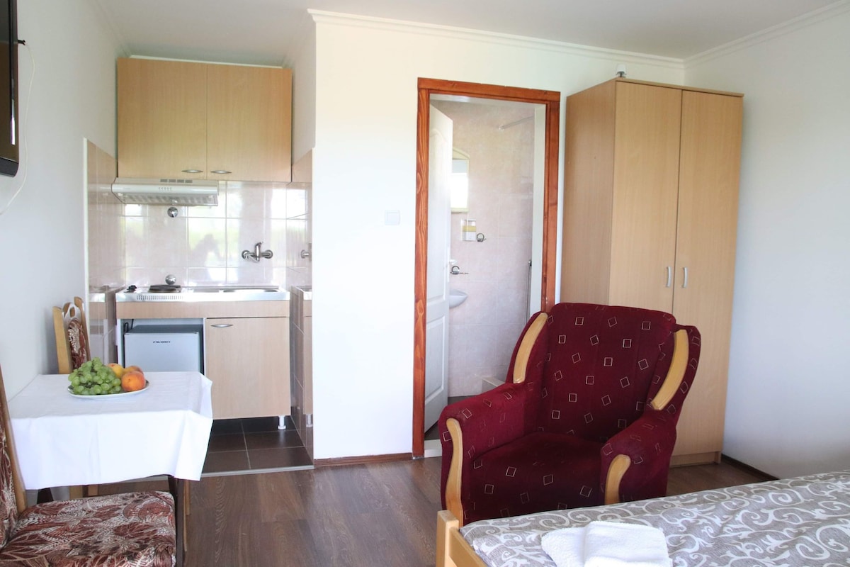 팔릭 호수에서 불과 200미터 거리에 있는 20평방미터의 스튜디오 아파트를 제공합니다. 스튜디오에는 더블 침대가 하나 있습니다. 최대 2인까지 이용가능합니다 스튜디오 아파트에는 시설이 완비된 주방, TV, 에어컨, 정원도 마련되어 있습니다. 오셔서 주변의 아름다운 자연을 만끽하실 수 있습니다!