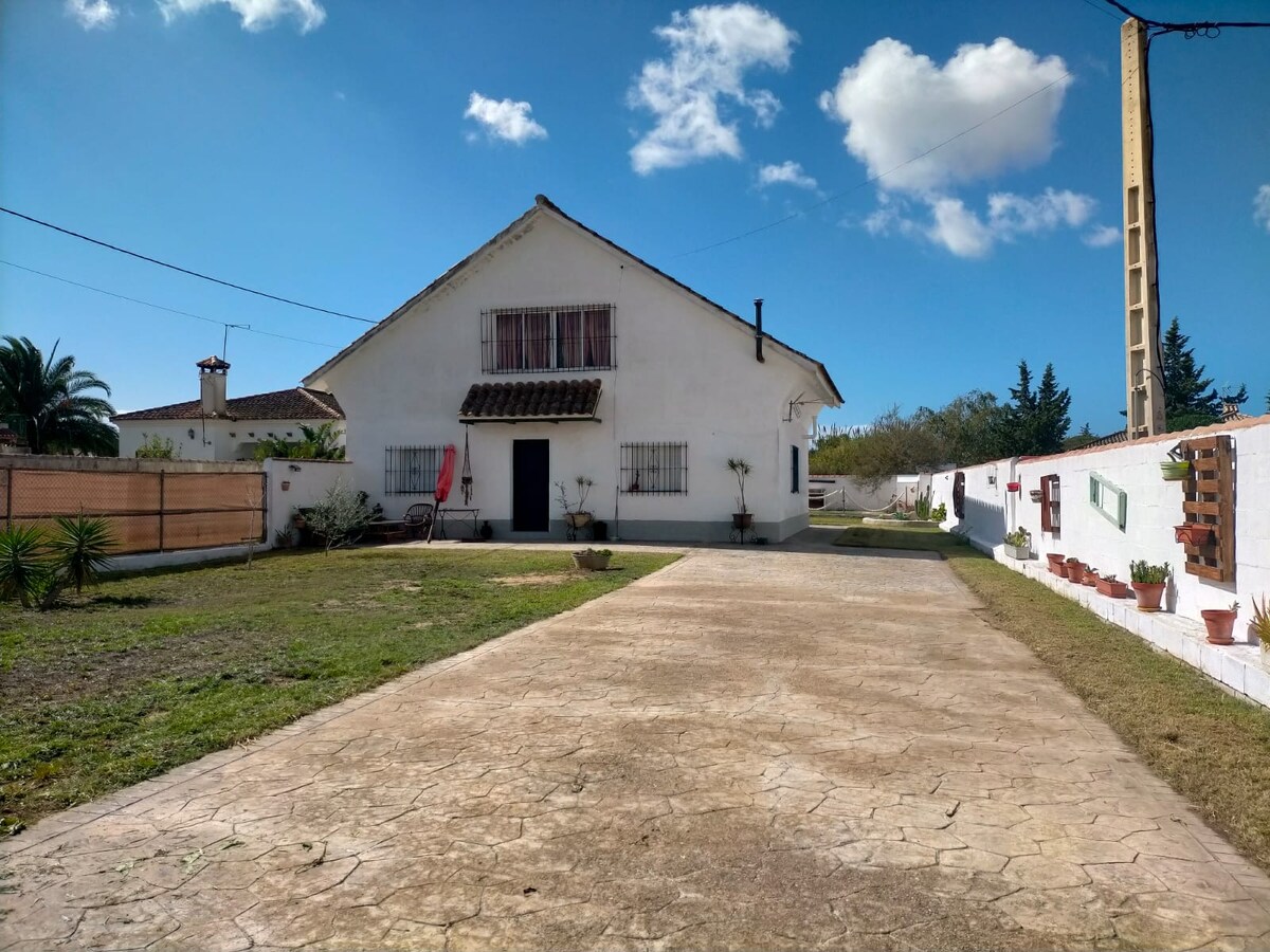 Bonito chalet con gran zona ajardinada. La vivienda consta de tres dormitorios dobles, cocina equipada, baño y salón. Cada dormitorio tiene un ventilador de techo. La zona ajardinada dispone de un gran patio y zona para aparcar. También tiene de piscina privada de agua salada con zona de solárium y zona de burbujas, ducha exterior y un aseo. Disponible barbacoa de gas, barbacoa de carbón y paella. A solo 12 min en coche de la playa.