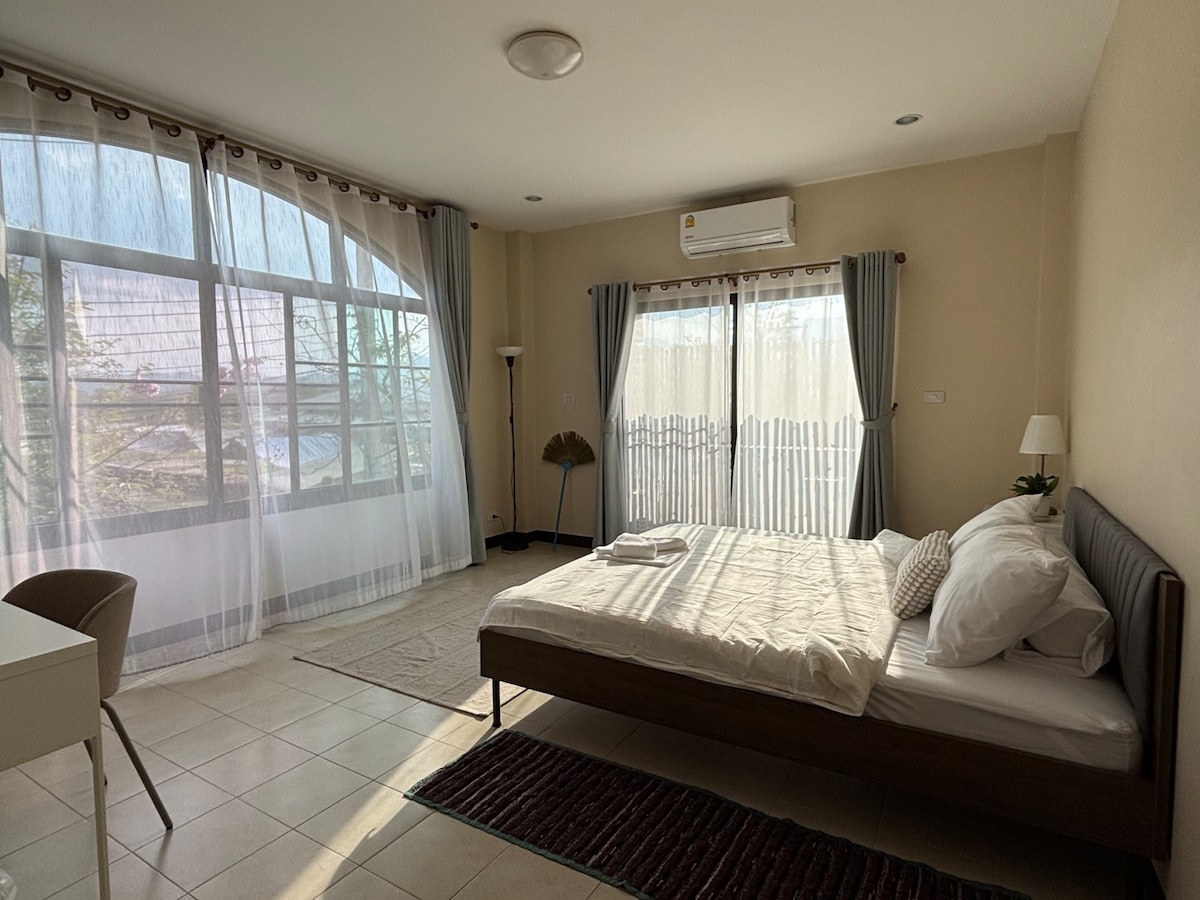 2층에 위치한 넓은 아파트로 멋진 산 전망을 자랑합니다. 킹사이즈 침대, 책상, TV, 냉장고, 샤워 시설이 있습니다. 같은 구내에 공용 피트니스 공간, 옥상, 정원, 작은 주방이 있습니다. 무료로 사용할 수 있습니다. 이 숙소는 아름다운 작은 하천에 인접해 있으며, 커다란 놀이터가 있는 토요일 시장 공원 바로 옆에 있습니다. 또한 많은 카페, 레스토랑, 요가 센터 및 코워킹으로 둘러싸여 있습니다. 도보로 10분 거리에 유명한 워킹 스트리트의 야시장도 있습니다.