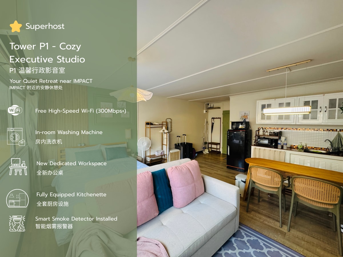 Prime P1 Studio | Near IMPACT Arena & Cosmo Bazaar Spacious city-view room in the heart of Muang Thong Thani. Walking distance to IMPACT Arena, Thunder Dome, and Cosmo Bazaar. Perfect for concert-goers and exhibitors. Highlights: ✅High-speed Wi-Fi (338 Mbps) & Smart TV ✅Queen Bed + Sofa Bed (Sleeps up to 4) ✅24/7 Self Check-in ✅Free Parking available ✅Surrounded by 7-Eleven, restaurants, and banks ✅ Safety First: ติดตั้ง Smoke Detector