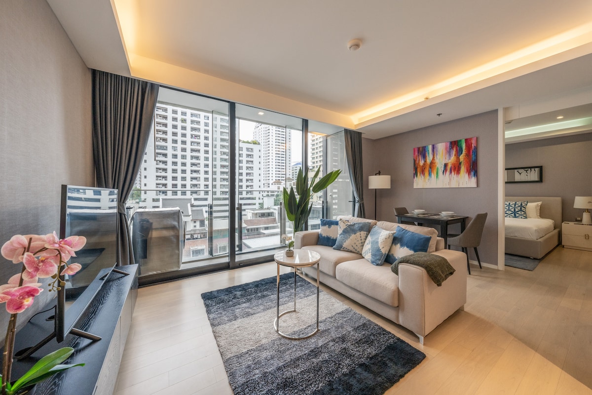 A spacious entire apartment with private bath, kitchenette, living/dining, 1 bedroom with designated working area, and balcony. Enjoy the wide windows for uninterrupted views and plenty of sunlight, increasing airiness for a more relaxing stay. Enjoy all the conveniences of city-life, including: - 5 min to BTS Asok, MRT Sukhumvit - 5 min to Terminal 21, Emporium/Emquartier and Benjasiri Park - 1 min to 7-11 convenient store - Lots of street food, cafe and taxi/bikes