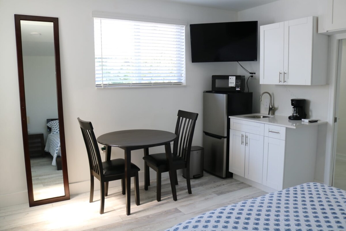 Luxurious Private Studio w/ Private Entrance (440 sq ft- can fit 3 people/2 cars) is attached to our home & 1.7 miles from beach & adjacent to Ft Lauderdale. Park under the covered carport. 1 Queen Bed (& 1 Queen Size-Blow Up Mattress), 1 Bath, Kitchenette, Fiber Optic Wifi, Flat Screen TV (140 channels), Impact Windows, Huge Closet, Fan/light, AC w/ remote, Desk, Chair, fold up/down Table for eating w/ chairs, small Fridge, Microwave, Toaster Oven, Foreman Grill, Hot Plate Stove, Coffee Maker.