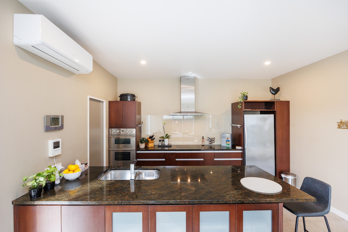 침실 2개, 개방형 거실, 식사 공간, 간이 주방, 욕실을 갖춘 독립형 전용 아파트입니다. 퀸사이즈 침대가 있는 마스터 침실. 두 번째 침실은 침실로 사용하거나 별도의 전용 사무실로 사용할 수 있습니다. 이동식 아기 침대를 이용하실 수 있습니다. 바닥에서 천장까지 이어지는 대형 창문과 거실 공간의 슬라이딩 도어가 있어 독립된 전용 파티오로 연결됩니다. 아파트에는 히트펌프가 있으며, 전체적으로 단열 처리가 되어 있고 이중 유리로 되어 있습니다. TV는 뉴질랜드 프리뷰 시청 가능. 숙소 전체에서 무선 및 유선 인터넷을 이용하실 수 있습니다.