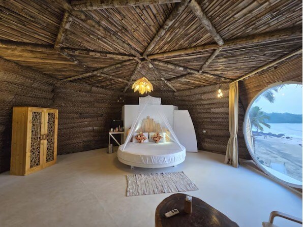 Brand-new Premium AC villa, elevated with a panoramic view of Patnem Beach Perched above the beach, our new Hillside Sea View Rooms offer a little extra comfort and style while staying close to nature. 60 sqm of bright, airy and private space designed for 2–3 guests, including a spacious bedroom with 180° windows (complete with blackout curtains) that bring the ocean and treetops right to your bedside.