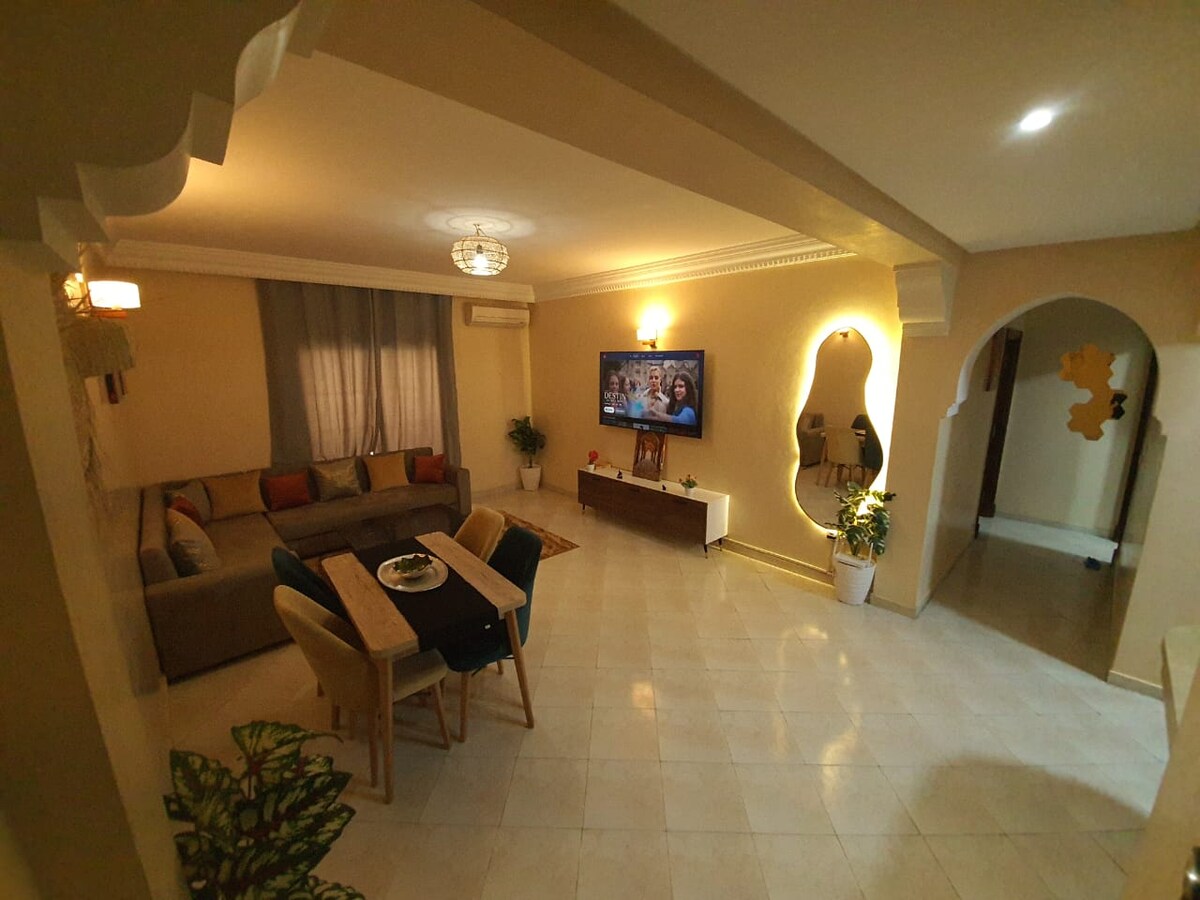 Appart de luxe situé dans une résidence calme à Dyour marjane, à seulement quelques minutes du Grand Stade de Marrakech, 2 chambres, salon moderne, wifi , Smart Tv avec netflix et ipitv ,cuisine équipée (congélateur, lave-linge, air fryer, machine nespresso et panini..)2 climatiseurs, fer a repasser, Draps, serviettes, check-in flexible inclus. À 15-20 min de la Médina et proche de marjane, Kitea, Decathlon. Idéal pour un séjour confortable en couple marié , solo ou pro.