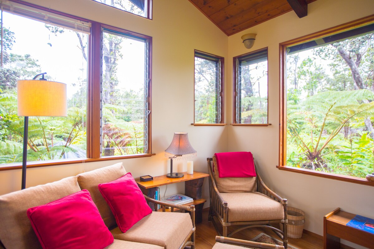 킬라우에아 화산의 숲이 우거진 경사면에 에메랄드 나무 꼭대기에 높이 숨어 있는 삼나무 통나무집은 하와이 화산 국립공원의 나후쿠(용암 관)에서 1.4마일(2.2km) 떨어진 토착 열대우림을 내려다봅니다. 이 숙소에서는 환경과 함께 지낼 수 있으며, 섬 주변에서 모험을 즐기고, 편안한 휴식을 취할 수 있습니다. 달빛을 받으며 안개 낀 숲, 은은한 은하수의 빛, 평화로운 아침 햇살, 멜로디한 새소리가 함께하는 시간을 보내세요.
