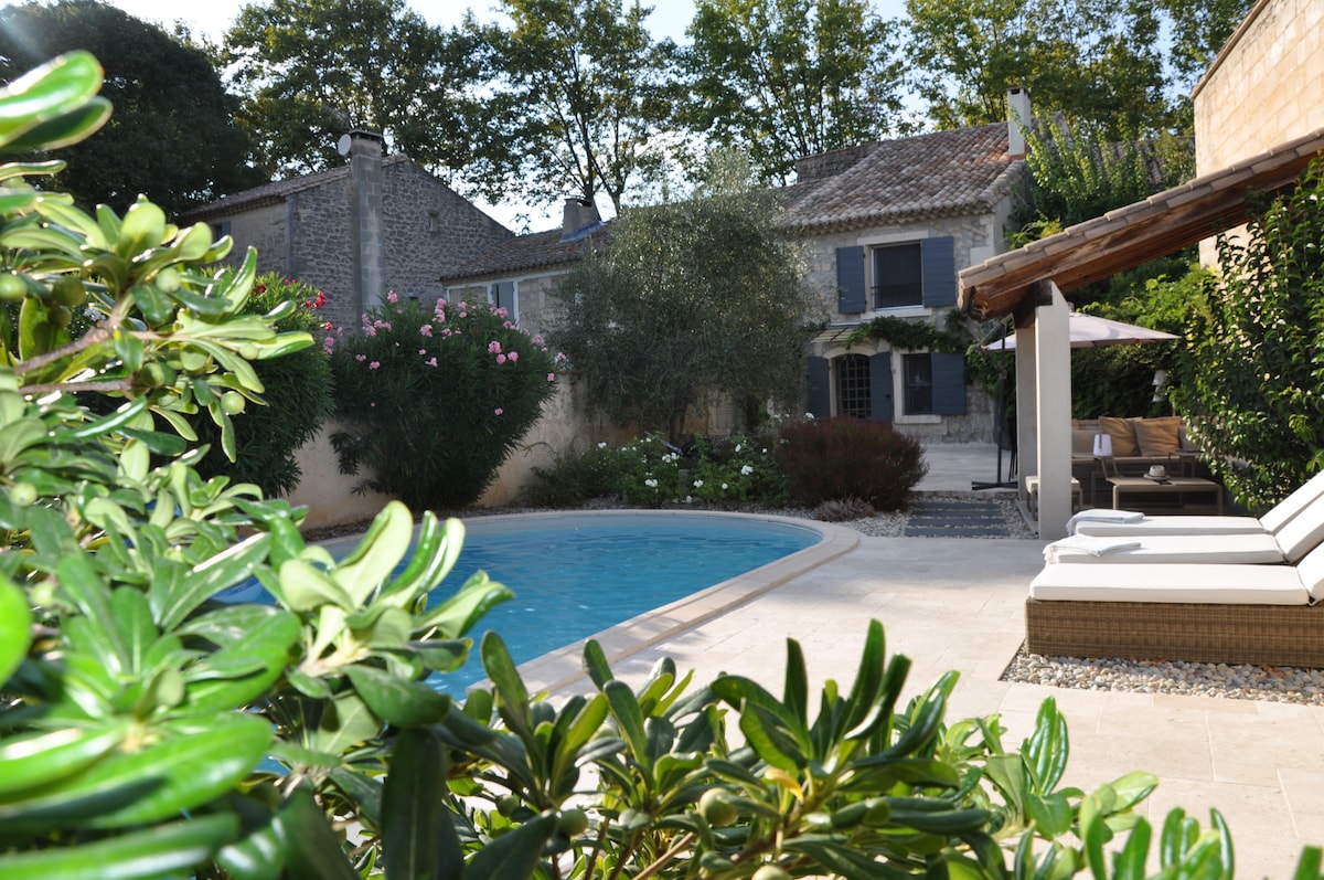 Charme authentique avec ses pierres et poutres apparentes, notre mas est entièrement climatisé avec ses 4 chambres disposant chacune de sa propre salle d'eau : 2 chambres dans la maison principale et 2 chambres dans 2 mazets indépendants. Salon avec cheminée, cuisine moderne avec ilot central. Large terrasse ouvrant sur le jardin à l'abri des glycines. Piscine (7x3,5m) chauffée de mai à septembre avec ses bains de soleil.
