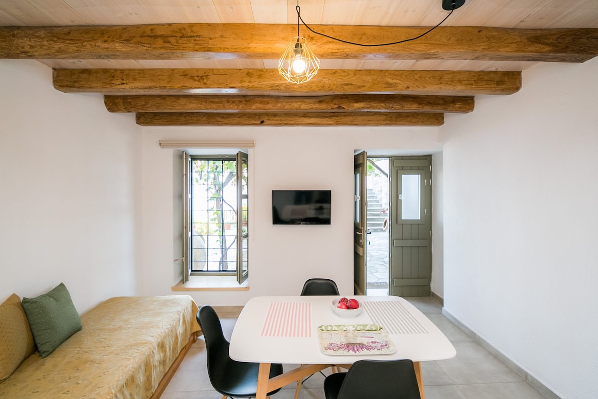The stone house, consists of 2 rooms a bedroom with a comfortable douple bed and a living room(sofa-bed) with a fully equipped kitchen . Morevover, it has a lovely terrace with a spectacular view to the sea and the village that in conjuction with the blossomed flowers, you will enjoy the tranquility of the habitat. It's a boutique apartment with unique décor considered as one of the best choices fo the visitor who wants to indulge the experience of the nature living.
