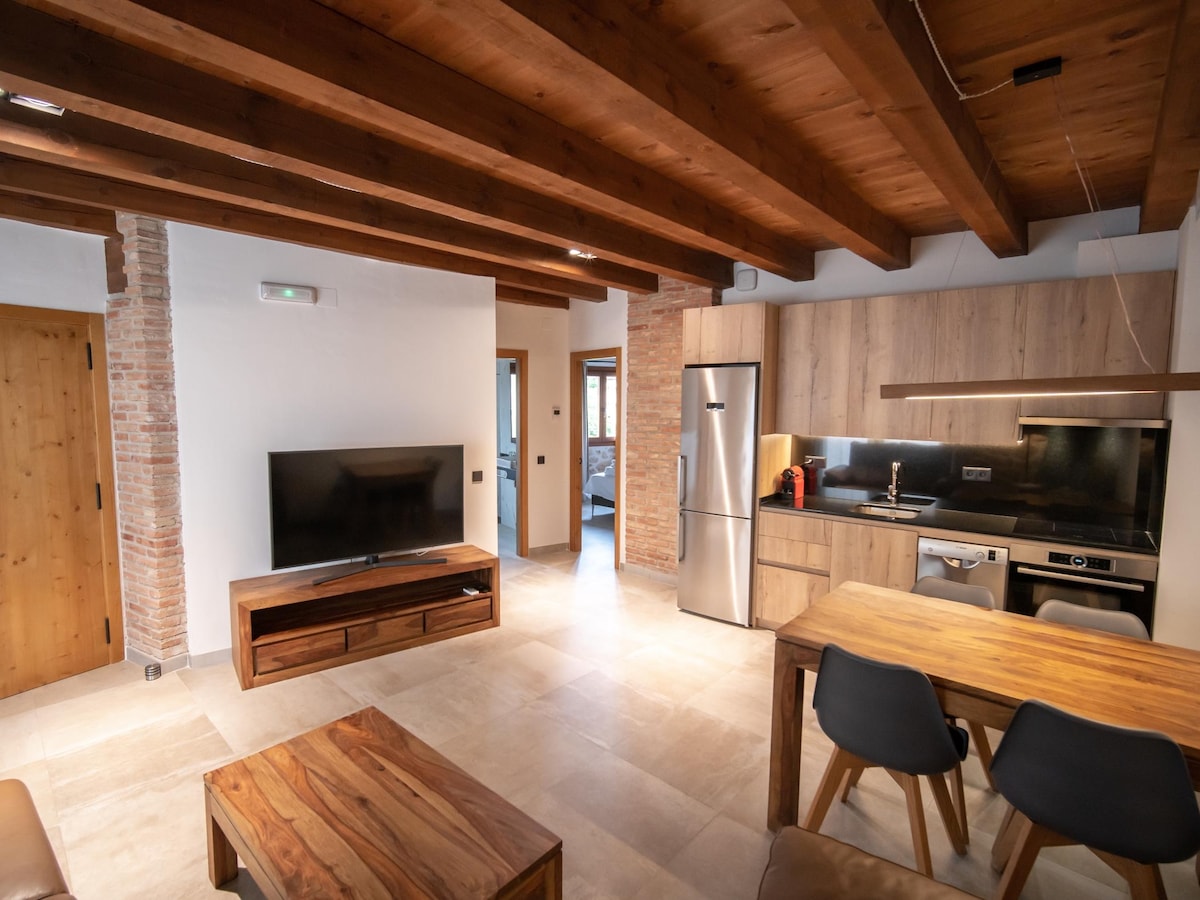 English: We transformed Cal Joanet, an old shepherd's hut in the village, in a cozy and functional home while preserving the original character (stone walls, wooden beams). You'll have the whole house for you and all amenities. Català: Hem transformat Cal Joanet, una antiga caseta de pastor dins del poble, en un habitatge acollidor i funcional tot preservant el caràcter original (parets de pedra, bigues de fusta). Tindreu la casa sencera per a vosaltres i totes comoditats.