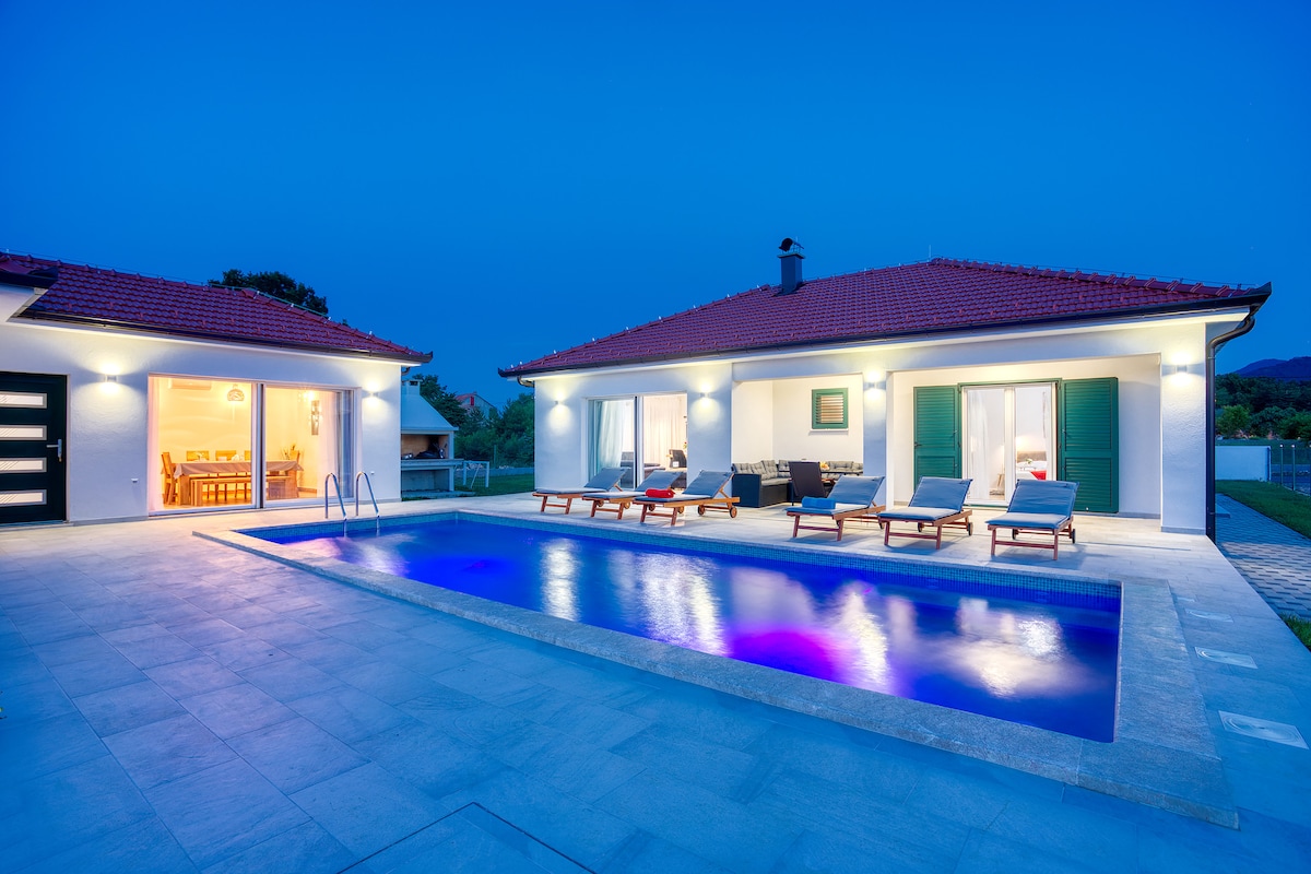 Novoizgrađena, moderno uređena kuća u prirodi nudi sve za ugodan boravak u mirnom okruženju uz potpunu privatnost. Veliki grijani bazen sa slanom vodom potpuno je okupan suncem od rane zore do zalaska.