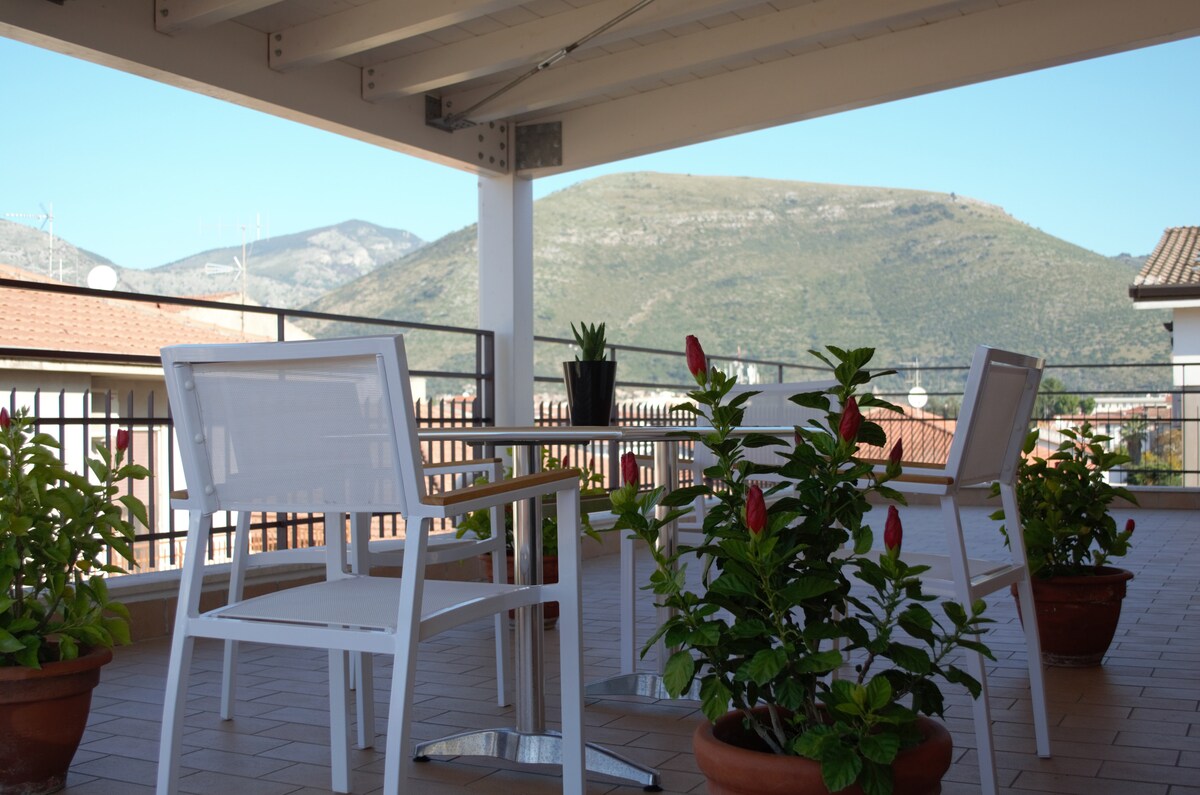 Signorile attico sito in prossimità del corso principale della ridente Gaeta, perla del golfo che ne prende il nome. La posizione dell'appartamento è al contempo sia centrale sia lontana dai rumori cittadini, per garantire un assoluto relax! Al piano terra, nel cortile dotato di cancello automatico, è a disposizione dei nostri ospiti un comodo posto auto all'ombra. Il punto di forza dell'attico è senza dubbio il suo terrazzo a livello con una vista mozzafiato sul golfo!! Vi aspettiamo