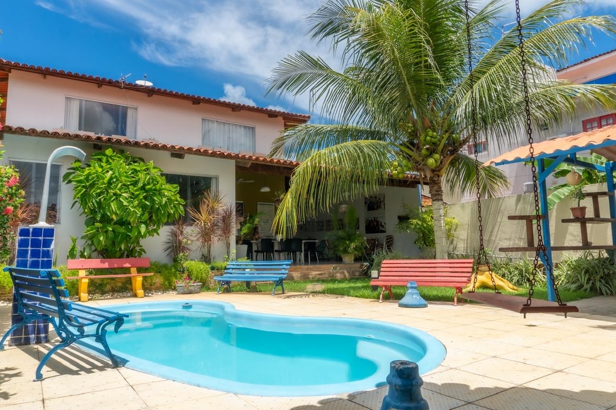 Casa ampla com 3 dormitórios para temporada, com espaço para hospedar até 7 pessoas confortavelmente, na região central de Paripueira, Litoral Norte de Alagoas, 3 banheiros, sala de estar, jantar, cozinha, área de serviço, piscina, redes para descanso, área de jogos com pebolim e sinuca e uma ampla área verde. Vaga para 4 carros. com Acesso rápido tanto à praia quanto à rodovia que liga à Maceió e ao litoral Norte.