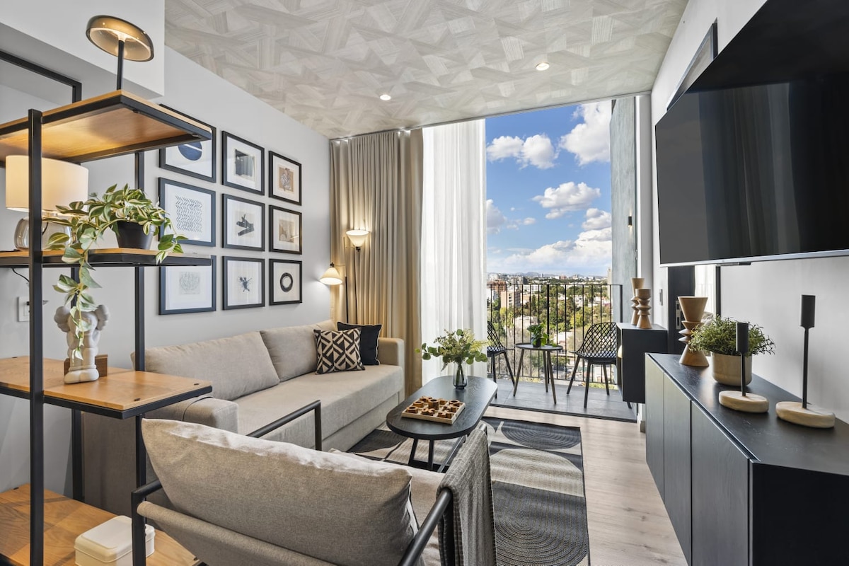 -22nd floor swimming pool -Beautiful gym with city views -Fully equipped for long stays -Parking available (at additional cost) - Housekeeping service: Once a week for reservation of +7 nights This deluxe studio with a balcony has everything you'll need for your stay. Located in a brand-new luxury tower in the Providencia neighborhood, near the Midtown Jalisco shopping mall.