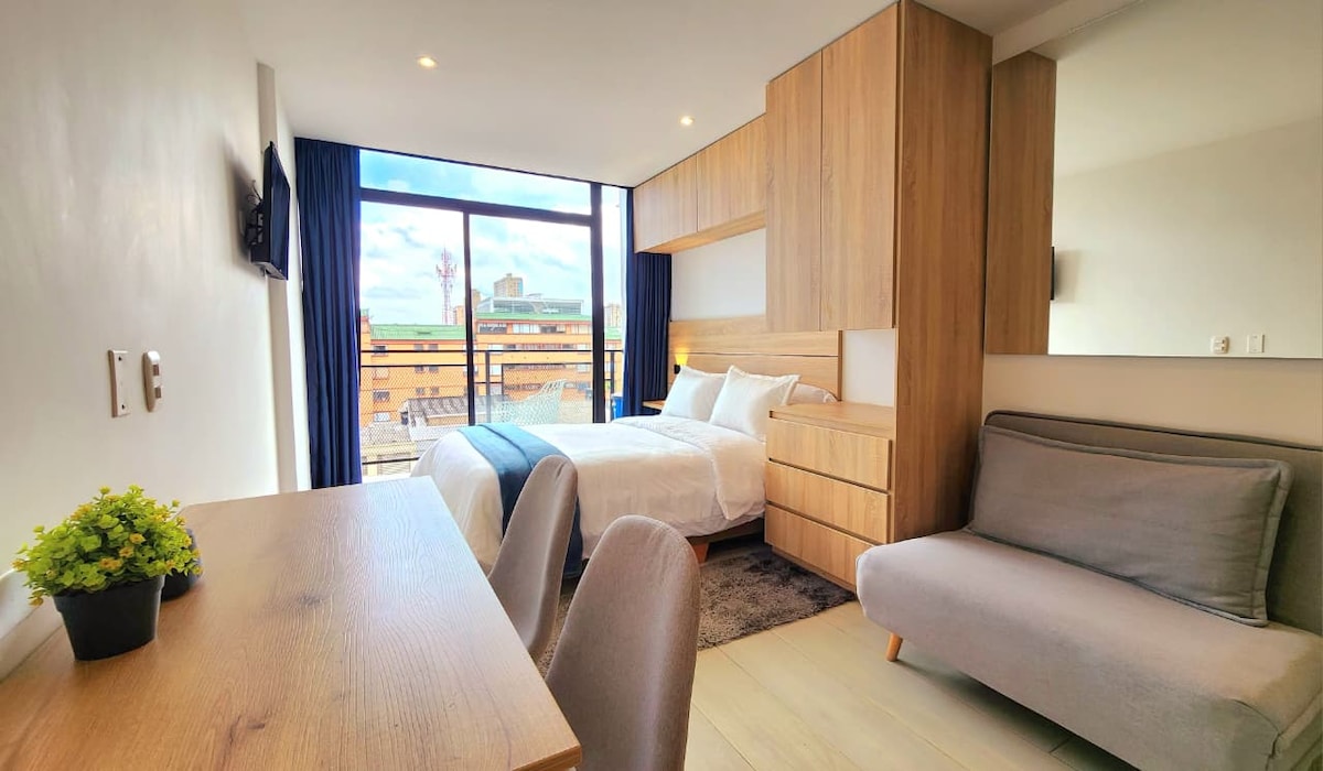 이 아름다운 스튜디오 아파트는 편안함, 따뜻함, 전략적인 위치를 모두 갖추고 있습니다. 보고타가 제공하는 모든 것을 즐기며 휴식을 취하기에 완벽한 곳입니다: 콘서트, 스포츠 경기, 심부름, 도시 휴가.엘 캄핀 경기장, 모비스타 아레나, 미국 대사관, 공항에서 몇 분 거리에 있습니다. 이 조용하고 밝은 공간에는 편안한 침대, 전용 욕실, 완비된 주방, 온수, Wi-Fi, TV가 갖춰져 있습니다.편안함과 좋은 위치를 찾는 여행객이나 커플에게 완벽한 숙소입니다.