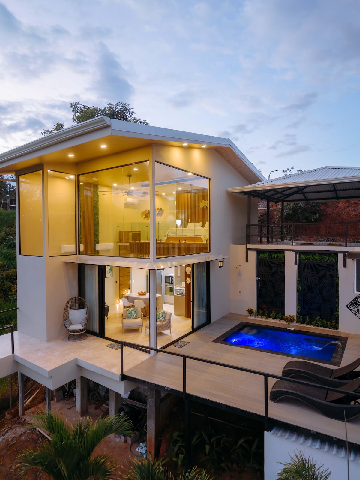 Secluded on the border of the Carara National Park and 25minutes away from the beaches. Casa Cielo is surrounded by Jungle and Waterfalls. At 1200 feet above the Central Pacific Coast, this location offers spectacular views of the Pacific Ocean and the Tarcoles River. You can expect to see Scarlet Macaws and Toucans flying by the house. Casa Cielo is a perfect match of luxurious comfort and immersion in nature but still connected featuring high-speed internet. Perfect for group stays.