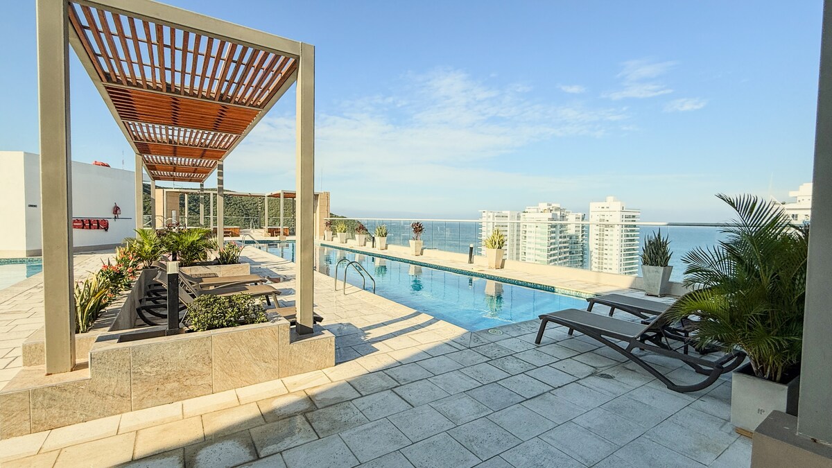 Luxury suite with a jacuzzi on the balcony. It is located in the best and most exclusive area of Santa Marta. It is next to the Hilton Hotel, Irotama Hotel, and Mercure Hotel. It has everything you need to enjoy an unforgettable vacation. The kitchen is fully equipped with a refrigerator, induction stove, pots and pans, coffee maker, kitchen utensils, microwave, and air fryer. It is 8 minutes from the airport and very close to Zazue Mall shopping center.
