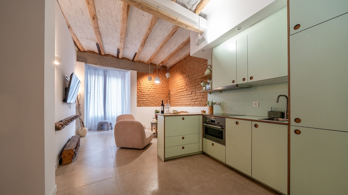 Small studio with high windows, NO OUTSIDE VIEW. Double bed or twin beds (subject to availability/not guaranteed). The decoration, colour and interior layout may be subject to minor changes. Kitchenette with kitchenware. Private bathroom with bathtub or walk-in shower (subject to availability/not guaranteed). Laundry, toilets with shower and shared lockers on floor -1.