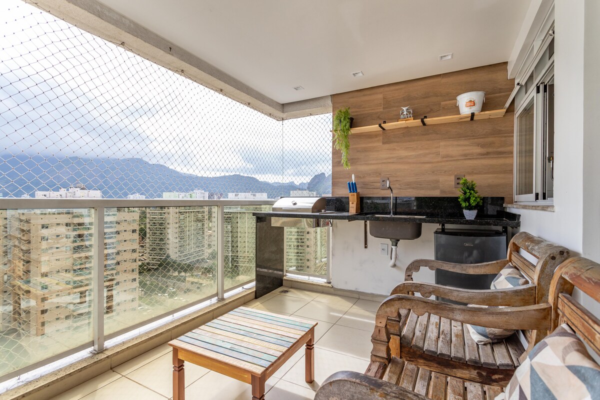 Apartamento muito confortável com tv 55", cama Queen, varanda vista montanha, microondas, cafeteira, frigobar, água aquecida na torneira e chuveiro, espelho na cabeceira da cama e dentro do box, ar condicionado, estacionamento gratuito, academia 24 horas. Próximo do Centro de Convenções Riocentro, Parque Olímpico, Farmasi, Jeunesse Arena, Rock in Rio, Shopping Metropolitano, Barra da Tijuca, Recreio e muito mais.