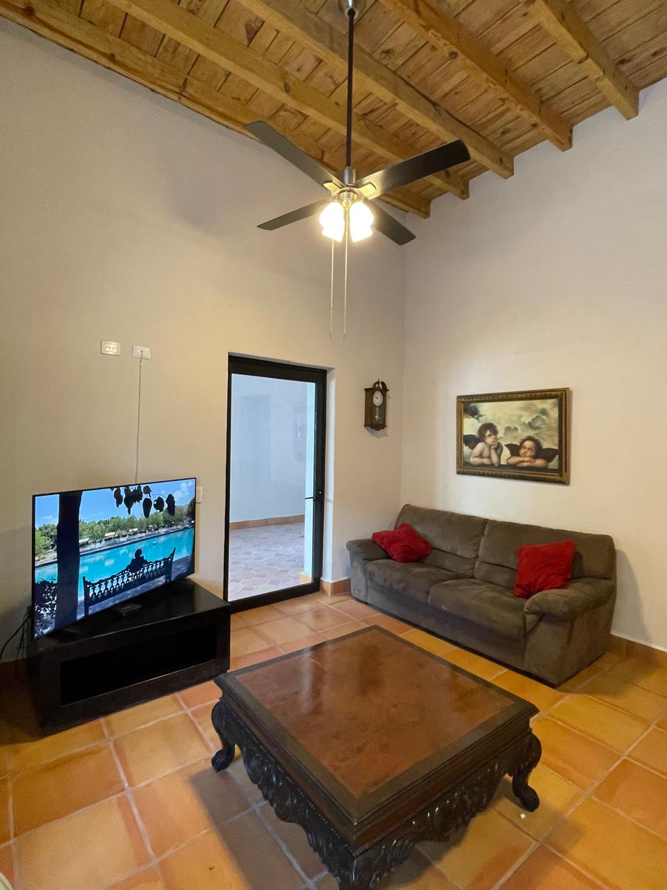 Linda casita con opción de una 3a recámara con baño (para 2 personas extras) Tiene un patio central con asador, mesa de jardín, con iluminación. Cuenta con cocina equipada con estufa, horno de microondas, vajilla y cuchillería, en el comedor una chimenea, clima mini split frío/calor, sala hay dos sofás con una TV de 55” con conexión a internet y cuenta con el servicio de Netflix . Todas las áreas con abanicos de techo y la sala-comedor y las dos habitaciones con minisplit f/c