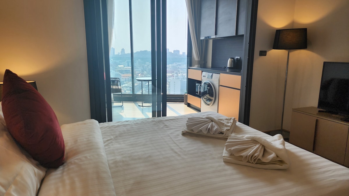 40층 26평방미터 스튜디오(킹사이즈 침대), 훌륭한 바다 전망 저희 객실은 유닉스 콘도미니엄에 있습니다. - 맛있는 현지 음식을 맛볼 수 있는 번화가에서 도보로 2분 - 주요 부두 및 고카트 트랙에서 도보 7분. - 워킹 스트리트까지 10분. - 해변까지 도보 20분 - 수영장 2개/사우나/헬스장 - 스카이 가든의 멋진 전망 - 우타파오 라용-파타야 국제공항까지 31km.