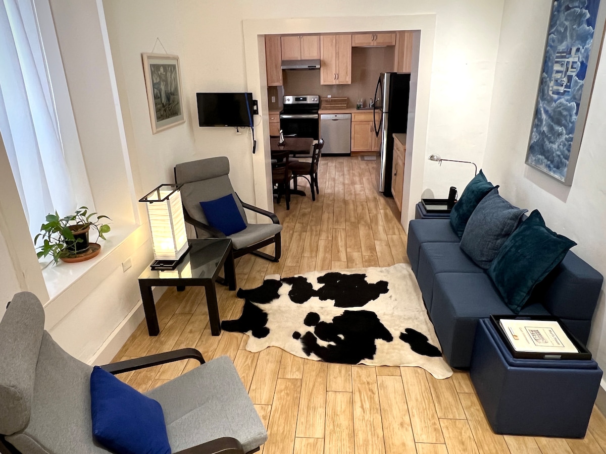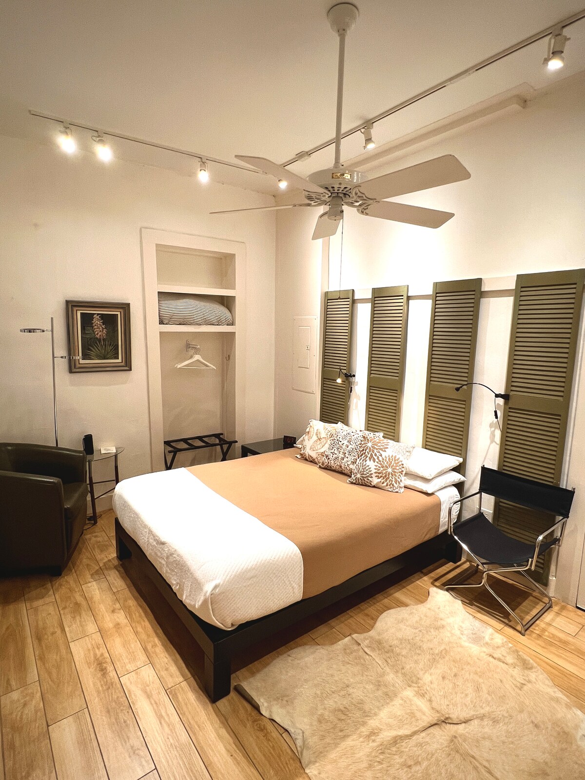 The ‘Avery’ is a must see studio space w/ free parking; featuring designer furniture and linens. Perfect location steps from the Plaza. This unit features a full kitchen, a fully tiled bathroom with original 1899 windows and hand selected mid-century modern furniture by local design firm Built Design. A Oaxacan-tiled backsplash and exposed beam accent the full kitchen. The unit is situated in the brand new 215 Washington ‘invisible service’ hotel just steps from the Santa Fe Plaza.