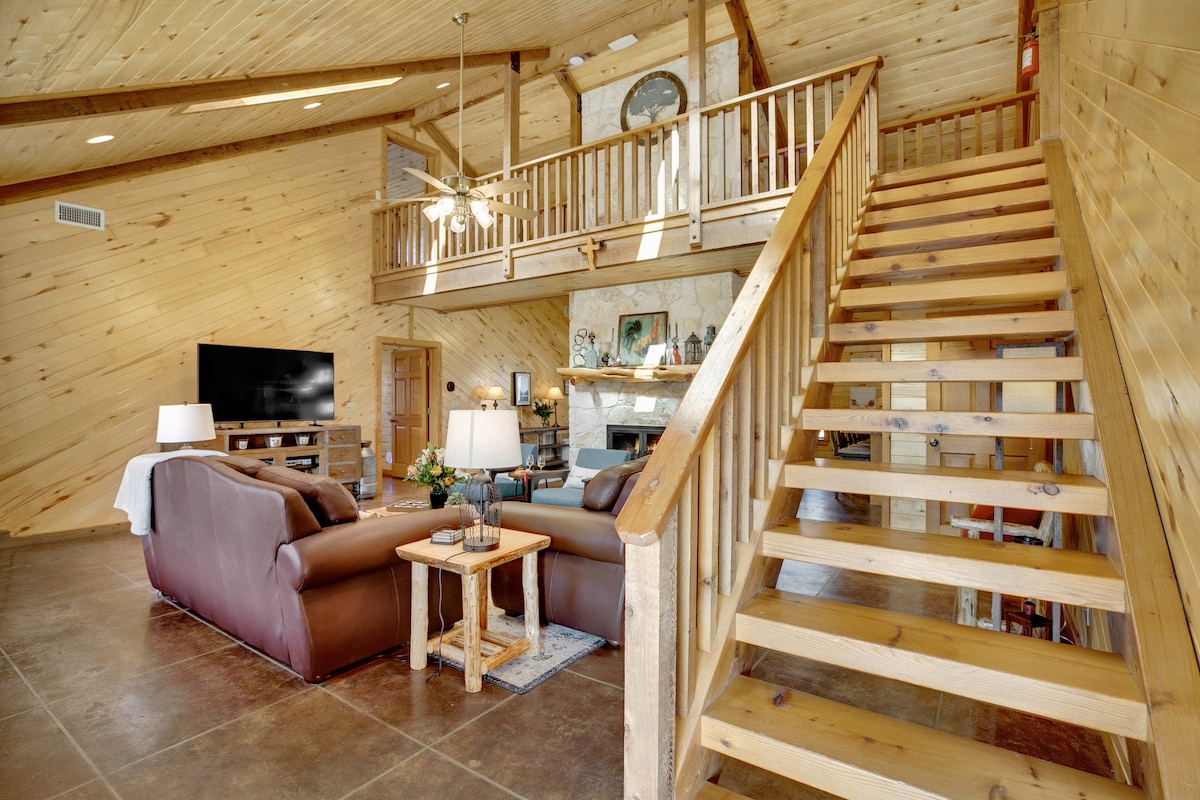 Escape to Shady Lane Lodge-a dazzling luxury log cabin sitting secluded on 3 acres in the heart of Texas Hill Country. With space for 16 spread out over 3500 exquisite square feet and a separate game room, Shady Lane Lodge has enough space for the whole family. Plus, it's wheelchair accessible. Located just two miles from town, you'll enjoy the calm serenity of this remote-feeling location while still being close to the shopping, dining, and entertainment of bustling Main Street Fredericksburg.