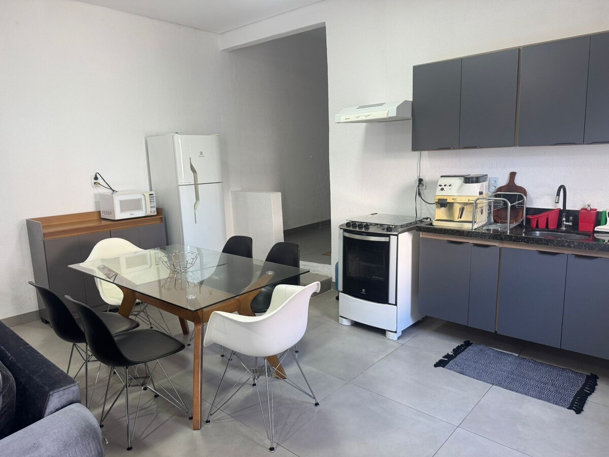 휴식을 취하기에 이상적입니다! 훌륭한 위치입니다! 쇼핑몰, 레스토랑, 슈퍼마켓, 약국 등에서 가깝습니다. - 더블 침대와 에어컨이 구비된 침실 1개 더블 매트리스 1개, 싱글 매트리스 1개, 업무용 책상 1개, 천장형 선풍기가 있는 침실 1개 - 전기 샤워실이 있는 욕실 - 소파, 에어컨, 42인치 TV, 식탁이 있는 객실; - 가스레인지, 냉장고, 식기가 구비된 주방. - 와이파이 인터넷 및 차량 1대용 차고. 조용하고 위치가 좋은 이 숙소에서 소박함을 느껴보세요!