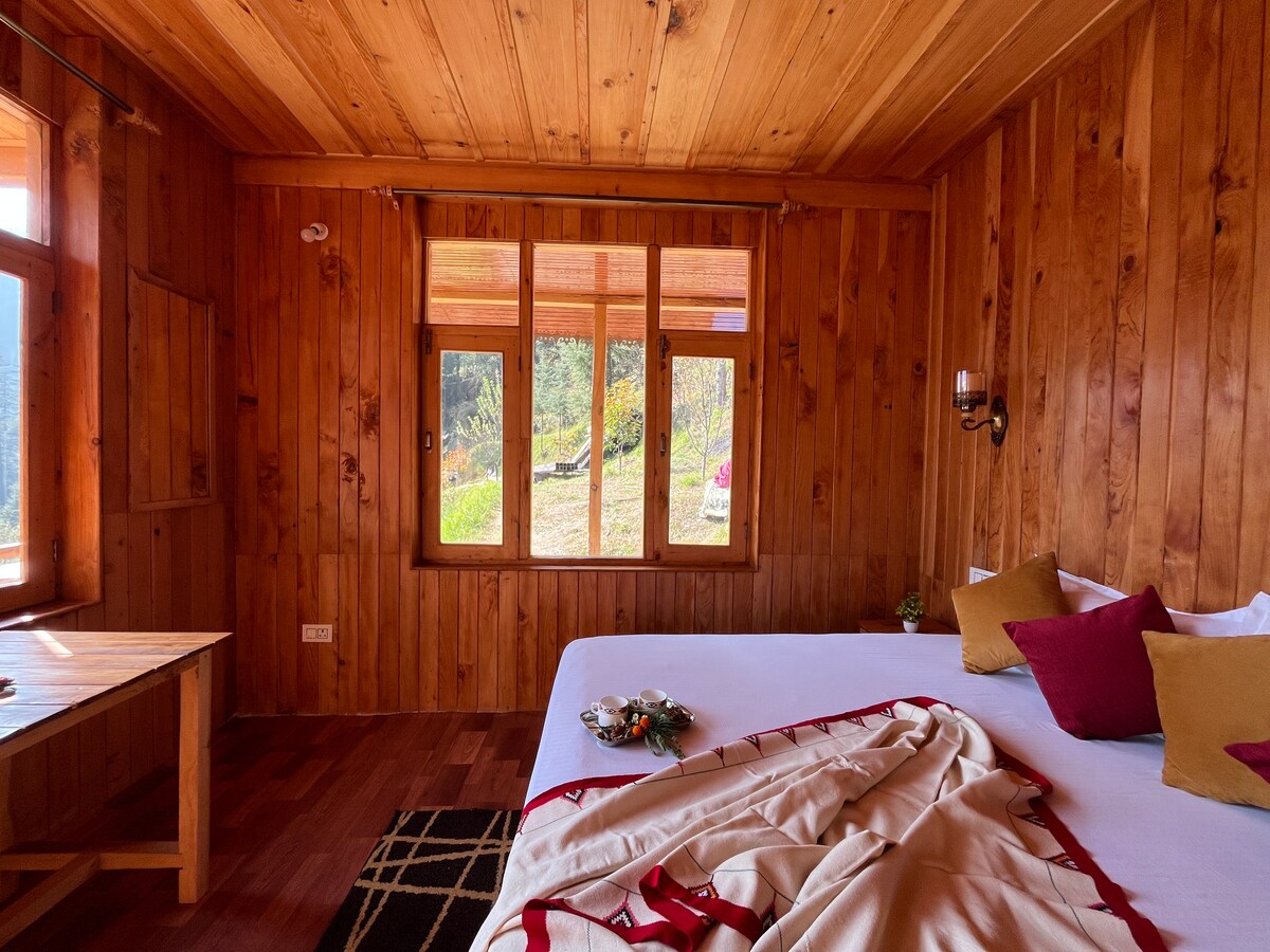 "Welcome to our cozy log cabin nestled in the heart of the enchanting Jibhi, Himachal Pradesh, where every morning, you'll wake up to breathtaking views of the majestic Jalori Pass. Our log cabin-style property provides a warm and rustic ambiance that's perfectly complemented by modern amenities for your comfort. The bedroom offers an incredible view of Jalori Pass, making each morning a magical moment as you open your eyes to nature's grandeur,