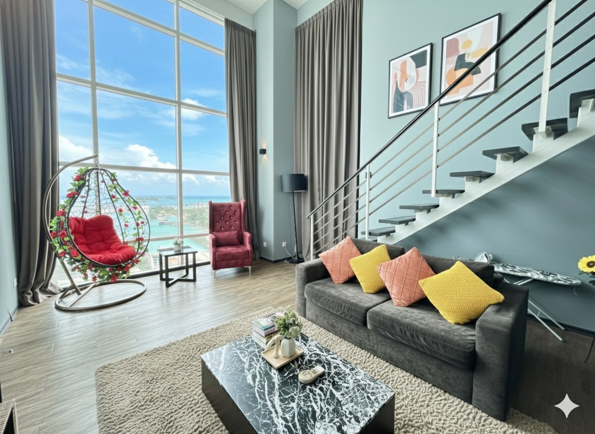 Enjoy a high-floor sea view duplex suite at Maritime Suites, Georgetown โ ideal for families, couples, or short stays. Wake up to beautiful sea views with easy access to Penangโs heritage sites, cafes, and shopping malls. This bright sea view duplex offers a comfortable living area, cozy bedrooms, and a fully equipped kitchen. Guests enjoy access to a swimming pool, gym, and 24/7 security, near Gurney Drive and key attractions โ perfect for a relaxing seaside stay in Penang.