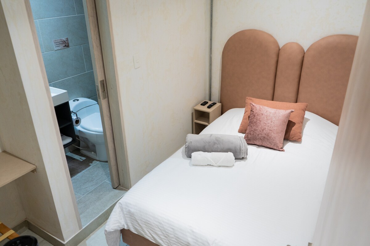 Habitación acogedora en el Hotel Montana, ideal para viajeros solos. Cuenta con una cómoda cama semidoble, baño privado, televisor Smart y ventilador. Estamos ubicados en la zona comercial del barrio Cuba, con fácil acceso a tiendas, restaurantes y transporte; a 5 minutos de Unicentro, Expofuturo, el Estadio y 10 minutos del aeropuerto. Perfecta para descansar después de un día de turismo o trabajo. Espacio limpio, tranquilo y funcional, pensado para una estancia práctica y confortable.