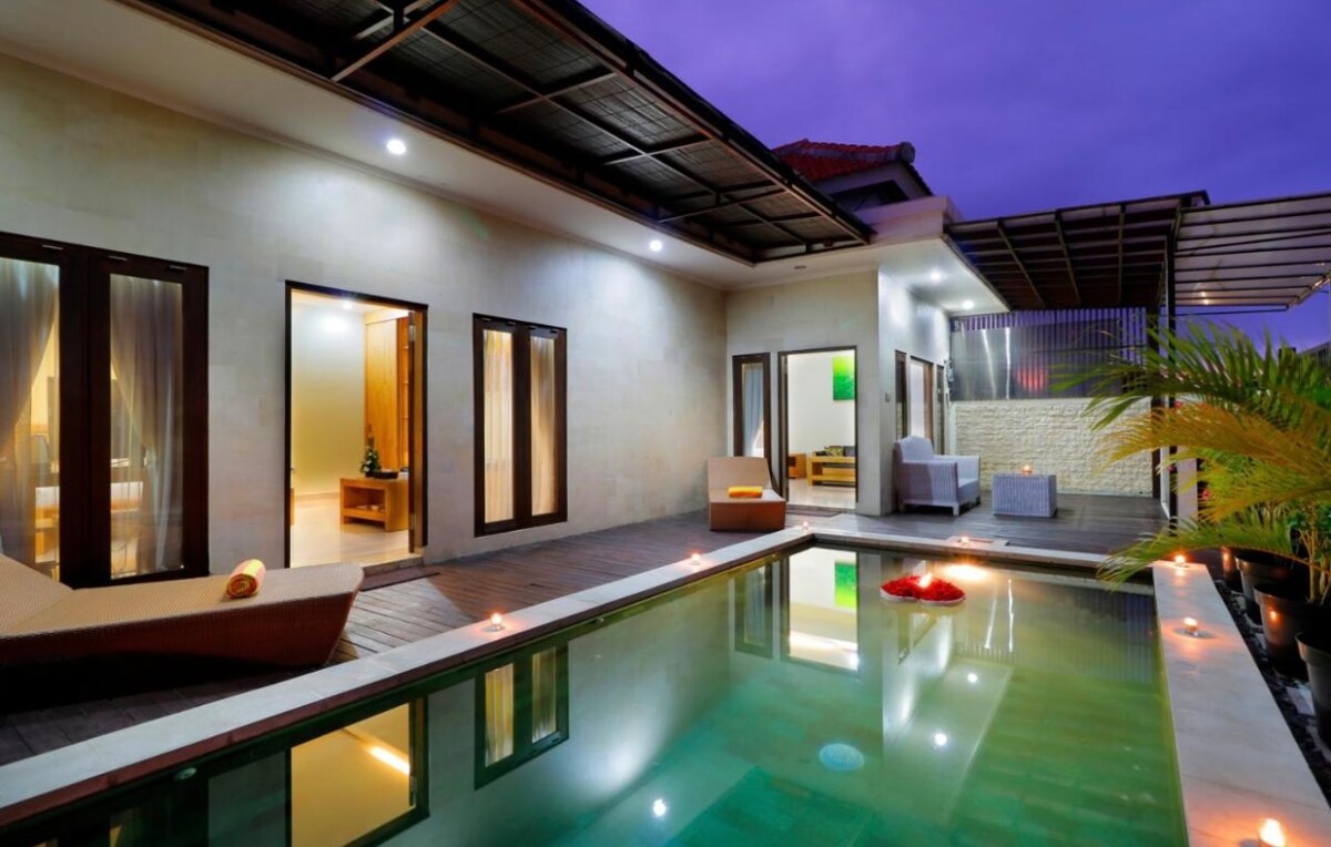 Unique, impressive and exquisite; this breath-taking 2-bedroom luxury villa with private pool blends Javanese form with contemporary and original interior design.A stepping-stone path over a Koi pond sweeps into the main pavilion, surrounded by water on three sides to give a feeling of a floating palace. Next to the masterpiece living room, there is a fully air-conditioned media room & office. This contemporary villa is perfect for get togethers, celebrations and private after parties.