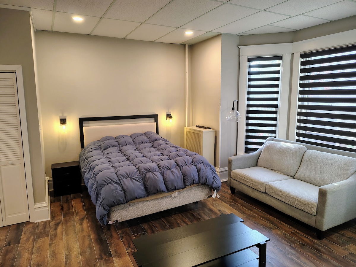 펜실베이니아 주 칼라일 시내의 유서 깊은 지역에 위치한 스튜디오 아파트. 편리한 위치 덕분에 상점, 명소, 레스토랑까지 도보로 이동할 수 있습니다. 카 쇼, 디킨슨 칼리지, 육군 문화 센터가 모두 불과 몇 마일 거리에 있습니다. 침대는 매우 편안한 대형 이불이지만 어떤 사람들에게는 다루기 어려울 수 있습니다. 거의 모든 사람이 매우 편안하게 지내고 있었습니다! 당일 예약의 경우, 게스트는 밤 9시 이전에 해당 날짜에 대한 예약 요청을 보내야 합니다.