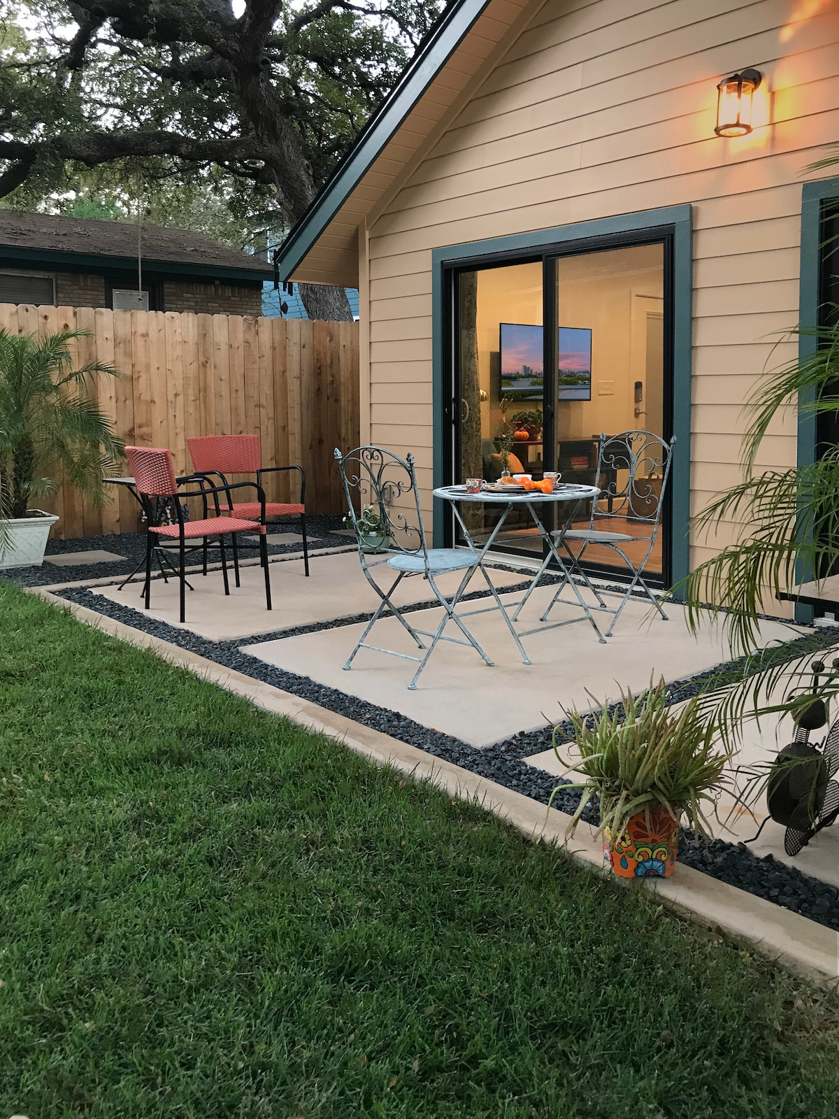 바튼 스프링스의 베티의 방갈로: 웅장한 라이브 오크 나무 아래 숨겨진 반짝이는 깨끗한 숙소. 사생활 보호를 위해 방갈로는 본채와 분리되어 있습니다. 무료 주차장, 완비된 주방, 높은 천장, 전용 파티오와 잔디밭으로 연결되는 이중 슬라이딩 도어가 있습니다. 바튼 스프링스 풀(천연 온천 풀), 레이디 버드 레이크의 11마일 트레일, 음악 공연장(ACL, 블루스 온더 그린 등), 바, 레스토랑 등 편의 시설까지 도보로 10분 거리입니다. UT까지 14분 거리입니다. 게스트가 사용할 수 있는 기타.