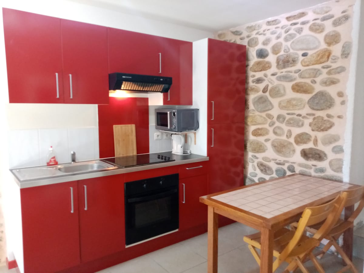 PLAGES 25 mn ESPAGNE 35 mn Perpignan centre 10 mn commerces et restaurants à pied Joli et confortable pour 2 personnes avec terrasse privative stationnement gratuit proche Très bon confort ! CLIM/ WIFI inclus - Cuisine équipée (four/hotte/frigo-congélateur/plaque vitro/micro-ondes/cafetière/vaisselle. - Salle de douche (cabine/wc/machine à laver le linge) - 2 lits 90x190 (sommier à lattes/ matelas confort) Lits d'accueil faits. - Terrasse