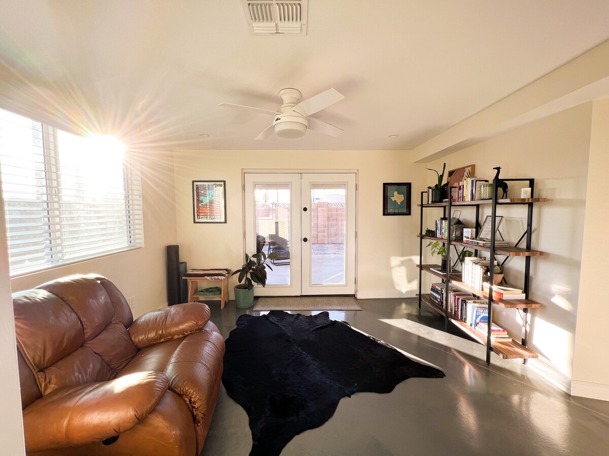 데저트 드웰링은 아카디아 라이트 지역에 있습니다. 도시에서 가장 트렌디한 지역 중 하나로 완벽한 휴양지입니다! 카멜백 마운틴에서 매우 가깝고 더 레블 라운지까지 도보로 갈 수 있는 거리에 있습니다. 공항은 차로 10분 거리에 있습니다. 더 데저트 드웰링은 전용 출입구가 있는 첨부 게스트 유닛(300평방피트)입니다. 커플 또는 1인 여행객에게 이상적인 숙소입니다. 숙소는 3명을 수용할 수 있지만, 퀸사이즈 침대와 풀아웃 소파가 있는 스튜디오 유닛이라는 점을 양해 부탁드립니다.