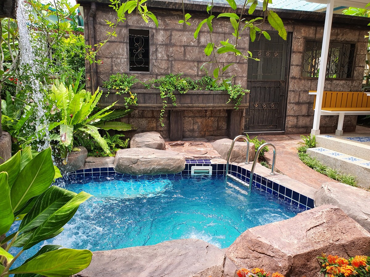 Relax with your family at this serene retreat surrounded by nature, offering stunning views of the sea and a rubber tree garden. Enjoy modern amenities including a pool, camping area, fully-equipped kitchen, and both indoor and outdoor living spaces. Conveniently located near a golf course, the beach, and the airport, this peaceful jungle hideaway provides the perfect blend of privacy and tranquility.