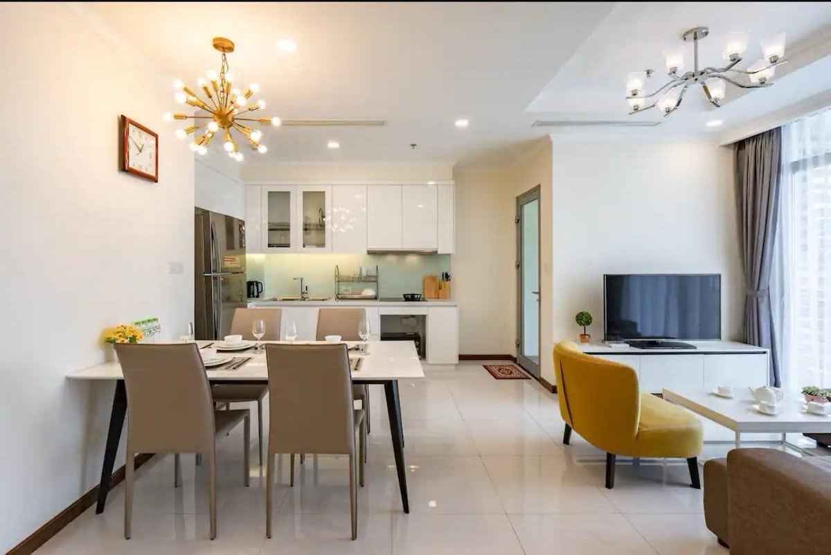 Cozy luxury apt on 6th floor located in a prime location just 10 minutes drive from the city center. 64sqm wide apt with all amenities and space to make you feel like at home. You can lie down on a soft king-size bed for a good night's sleep, cook in the kitchen, lie on the sofa watching the Landmark 81 building sparkle at night or sip a hot cup of coffee on the balcony watching the sunrise. A luxurious rooftop swimming pool, 2 mini supermarkets: 7 eleven and Winmart. Friendly and helpful owner.