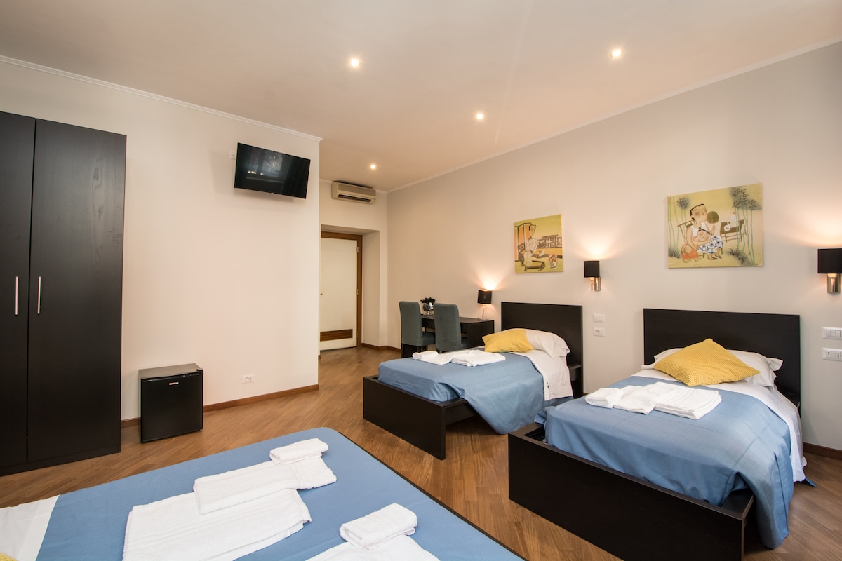 Elegant and comfortable room for four people with air conditioning, mini-fridge, and private bathroom. Located 10 minutes walking from the Vatican and 5 minutes walking from Ottaviano subway metro station. The neighborhood is safe and well connected for a comfortable stay in Rome.